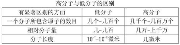 高分子與低分子的明顯差別各自反映在下面三個(gè)層面:一個(gè)分子中所包括的分子數(shù)量,分子量,分子長度。
